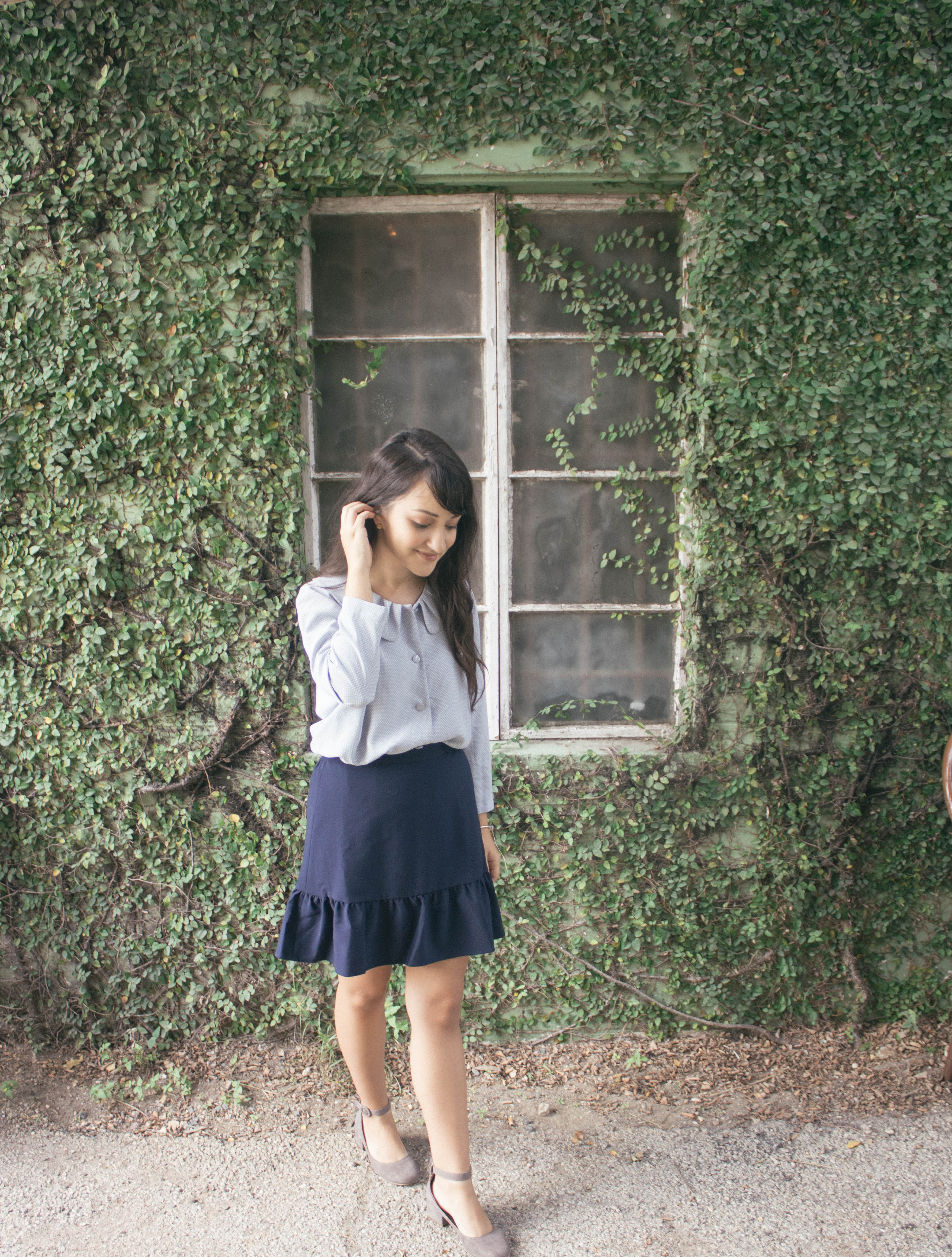 I was immediately drawn to the peter pan neckline and the delicate baby blue color in the first top. I paired it with a navy blue peplum skirt and gray low heels. But I can see myself wearing it with white or dark jeans for a more casual look.